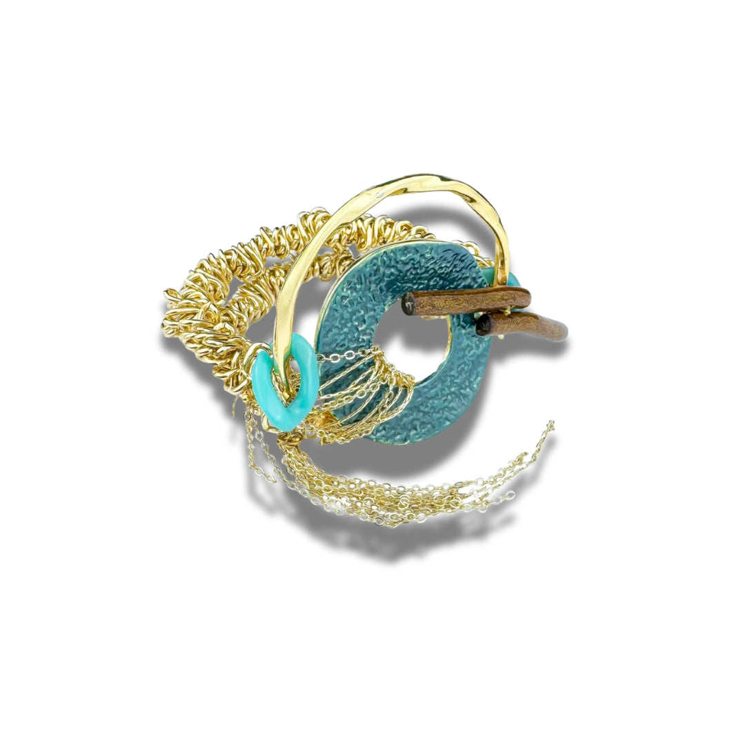 Paired with warm wooden accents and cascading golden chains, it creates a stunning contrast of natural and artistic elements. The layered details and intricate craftsmanship give this bracelet a dynamic, free-spirited vibe, perfect for those who love to express their individuality.